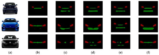 To enhance the segmentation performance of headlights and grilles in the automotive front face dataset, this study introduces the DCGCN and MSAG modules into the TransUNet network. To further assess the effectiveness of these improvements, four sets of ablation experiments were conducted. The outcomes are presented in Table 2, and the visual representations can be found in Figure 5.