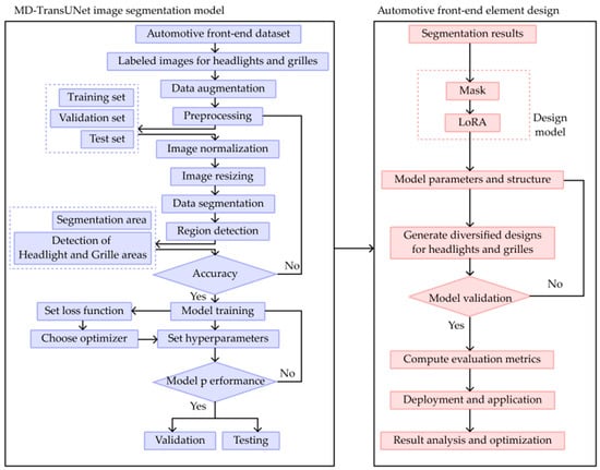 This paper introduces a MD-TransUNet network, which enhances the TransUNet network with the DCGCN and MSAG modules for segmenting headlights and grilles in automotive front face images. The MSAG module is integrated with skip connections to enhance valuable features, while the DCGCN module bridges high-level and low-level features between the encoder and decoder, dynamically adjusting convolution kernels to capture image details and improve segmentation accuracy. The experimental results indicate that the proposed network surpasses six other models, such as DeeplabV3+, DNLNet, and SegFormer, demonstrating outstanding performance on the dataset. Furthermore, by inputting the precisely segmented car front face image masks from the MD-TransUNet model into a diffusion model, diverse car front face designs can be generated. This approach allows for the flexible adjustment of detailed elements, such as headlights and grilles, while maintaining the overall design consistency of the car front face. This aids in analyzing and comparing the visual effects of different design elements, significantly reducing design iteration time and costs, and improving design efficiency. This approach offers new inspiration and direction for the automotive design industry. For example, various shapes and sizes of headlights and grille layouts can be quickly generated and compared to find the optimal design.