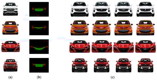 Diversified designs of headlights and grilles on the automotive front face (a) Original Image; (b) Mask; (c) Front Face Diversified Design Schemes.