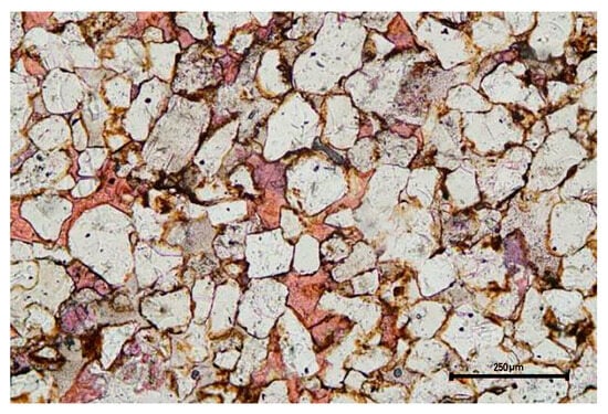The red sandstone utilized for the experiments was sourced from a consistent rock block, characterized by uniform textures and lacking significant structural or compositional variations. The red sandstone specimens were ground, polished, and machined to slices, of which the components and structures could be observed under a polarizing microscope. The outcomes of the experiments are presented in Figure 1. The specimen mainly contained ultra-fine-grained sand, some fine-grained sand, and a small amount of coarse-grained sand. The sandstone studied in this paper had high strength and strong cementation. The rock structure was inhomogeneous and showed low maturity and moderate weathering and alteration. The components in the rock mainly included quartz, rock debris, and a small amount of feldspar, with granular kaolinite filled between grains, which were probably formed by the alteration of argillaceous rocks. A small amount of argillaceous matrix was distributed between grains [,]. The rock material was fashioned into cylindrical specimens conforming to standard dimensions, measuring 50 mm across and 100 mm tall, adhering to the mechanical testing standards for rock. The parallel alignment of the top and bottom surfaces was maintained to a precision of ±0.02 mm. Prior to initiating the triaxial experiments, the specimens’ longitudinal wave velocity was assessed using an RSM-SY6 ultrasonic testing device (Wuhan Sinorock Technology Co., Ltd., Wuhan, China), and the samples were further selected based on their weight. The fundamental physical properties of these specimens are detailed in Table 1.