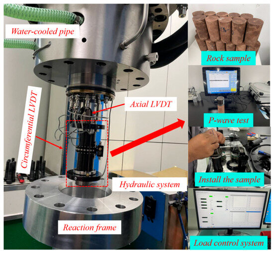 The triaxial test in this paper was conducted using the MTS-815 electro-hydraulic servo rock mechanics (MTS Systems, Eden Prairie, MN, USA) test system (as shown in Figure 2). During the test, the confining pressure was applied using liquid, the radial pressure σ2 = σ3, and the radial strain was measured using a chain-type transverse (radial) strain gauge. The radial strain was equal, that is, ε2 = ε3. This system integrates a loading mechanism, testing apparatus, and control unit, equipped with devices to measure axial and radial (transverse) strains. It supports various modes of load control, including force, stress, displacement, and strain, thereby facilitating the execution of triaxial loading and unloading along diverse and complex paths. The investigation involved conventional triaxial compression tests and CLU trials on sandstone samples, subject to six distinct confining pressures spanning from 1 MPa to 25 MPa. The experimental procedure was divided into two main parts, with the methodologies outlined in Table 1. Detailed procedural steps for both experimental approaches are provided below: