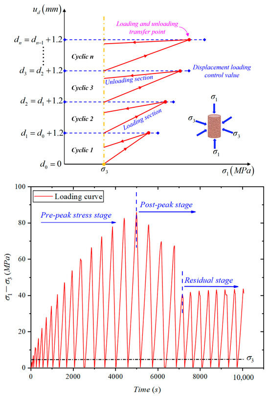 - Cyclic triaxial testing for loading and unloading: engineering practice has shown that, during construction and excavation of deep underground engineering including roadways (caverns and tunnels), the stresses on the surrounding rocks of previously excavated roadways change constantly due to the influence of subsequent construction (face mining and surrounding rock support) distributions. The initial stress state of surrounding rocks before excavation (equivalent to initial loading state, in which energy is input and accumulated) gradually changes to a state of stress redistribution induced by rock excavation (equivalent to an unloading state, in which energy is dissipated and released), to a stress state of subsequent surrounding rock support or mining-induced stress (loading state), to a state of stress release due to deformation of the surrounding rocks (unloading state), and so on. To accurately replicate the fluctuating stress conditions surrounding excavated roadways, simulations were conducted using CLU stress paths, as depicted in Figure 3. Initially, confining pressures were set to predetermined levels (1, 5, 10, 15, 20, and 25 MPa) as per the first two steps of the standard triaxial compression protocol. Given the challenge of capturing post-peak stress–strain responses under uniaxial CLU, tests with low confining pressure (σ3 = 1.0 MPa) were specifically designed to evaluate the effect of confinement pressure on the energy of the rock development. Axial loading proceeded at a pace of 0.002 mm/s, controlled by axial displacement, with each cycle’s load gradient set at 0.12 mm. Upon reaching the predetermined axial displacement, the system switched to stress-controlled mode to lower the axial stress at a decrement rate of 1.0 kN/s until the specimen reached its residual state, marking the end of the test. To mitigate any impact from the specimen detaching from the press head, a new cycle commenced only after reducing the axial load back to 1.5 kN upon unloading completion. The displacement pattern was adjusted as follows: from d0 (the initial displacement under load, typically 0) to d0 + 0.1 mm (the set axial displacement value for loading), back to 0 (during axial stress unloading), then to d0 + 0.2 mm (for the next loading phase), and so on, continuing this cycle until reaching the residual stage where the test concluded.
