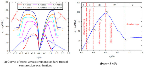 Figure 4 illustrates the stress–strain relationships for sandstone that underwent standard triaxial compression examinations at varying confining pressures, revealing consistent pattern traits across the curves. The breakdown process of the specimens is broadly categorized into five phases based on the curve features: Stage Ⅰ represents crack closure, Stage II is the phase of elastic deformation, Stage III involves crack propagation, Stage Ⅳ is the macroscopic failure phase, and Stage V is the residual phase. An analysis of the curve characteristics, using a confining pressure of σ3 = 5 MPa as a case study, is presented in Figure 4b. The distinguishing features of each phase are detailed as follows: