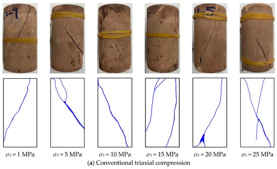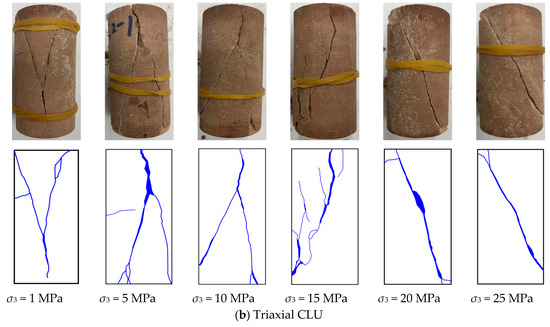The fundamental mechanisms behind the deformation and fracturing of rock materials are primarily governed by the emergence, growth, and merging of micro-cracks within the natural rock matrix. Figure 6 illustrates the ultimate failure patterns of sandstone samples under varying confining pressures, clearly indicating that macroscopic fracturing of the rock specimens typically presents as shear failure during standard triaxial compression tests. This phenomenon is similar to the results of studies by Du and Chen et al. [,]. For confining pressures ranging from 1 to 20 MPa, the breakage planes within the specimens remain relatively straightforward, with minimal secondary cracking and the primary fissure not spanning the entirety of the specimen. At a confining pressure of 25 MPa, the fractures evolve into tensile–shear types, fully traversing the specimen’s surface and forming an X-shaped fracture plane. In CLU experiments, the specimens suffer extensive damage, predominantly exhibiting tensile–shear failure along with some shear fracturing. Contrary to outcomes from standard triaxial compression tests, subjected to varying levels of confining pressures (1, 5, 10, and 15 MPa), a complex network of primarily shear or tensile fractures complemented by secondary cracks develops, whereas at 20 and 25 MPa, shear failure extending across the specimen’s surface is observed. This analysis underscores the following: (1) under lower confining pressures, as the axial load increases, slippage of oblique micro-cracks—which are more prevalent than transverse cracks—leads to their propagation and eventual coalescence into a macroscopic fracture plane, resulting in shear failure of the specimen. (2) When subjected to increased confining pressures, the external confinement inhibits the slippage of oblique cracks, causing them to extend along their initial paths and merge into a comprehensive shear fracture from top to bottom of the specimen. Overall, the prevailing mode of failure in sandstone, across a range of confining pressures, primarily involves shear deformation. This insight is crucial for designing support strategies aimed at mitigating shear failure, especially during the construction and excavation of deep underground caverns subject to high geostress, to prevent extensive damage to the intact rock surrounding the structure.