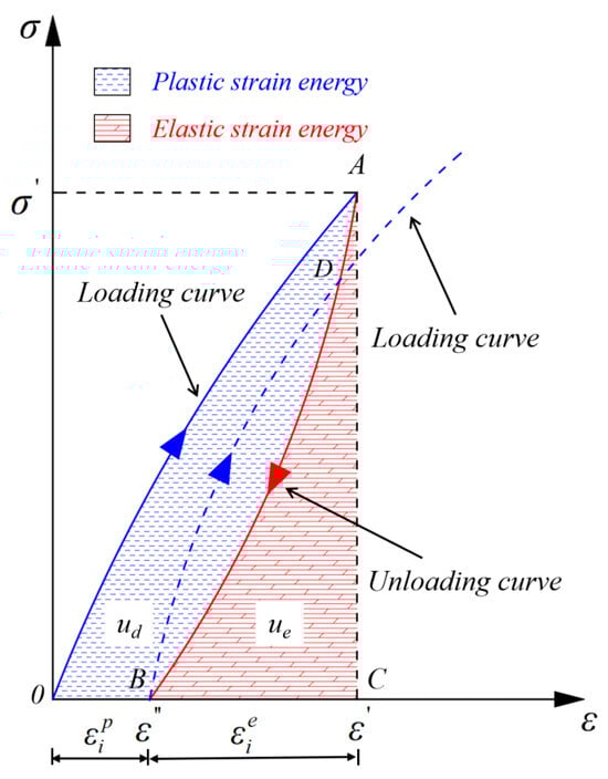 The assumption is made that experiments were performed in an isolated system without thermal interaction with the environment. Following the law of energy conservation, the total energy present in the rock stays constant throughout the process. The external forces applied to the rock convert into recoverable elastic strain energy and irrecoverable dissipation energy due to the external loading. Hence, following the principle of energy conservation, the equation is as follows [,,]: