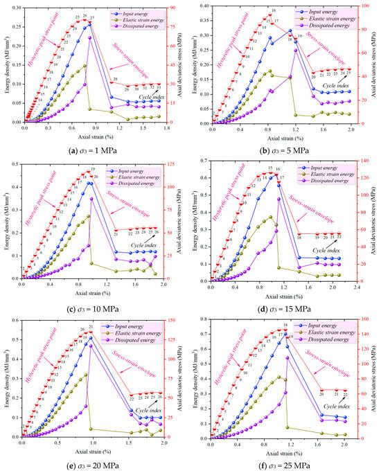 The energy density for each phase of the rock specimens was determined using the stress–strain data from CLU tests at varying confining pressures, following the energy calculation methodology outlined in Section 4.1. Based on these calculations, graphs illustrating the relationship between input energy and strain, dissipated energy and strain, and the ratio of energy dissipation to strain were created, using the strain at each cycle’s unloading point as the x-axis. Furthermore, stress–strain envelope curves were constructed for the CLU tests, utilizing the stress and strain values at the unloading points of each cycle, as depicted in Figure 8.