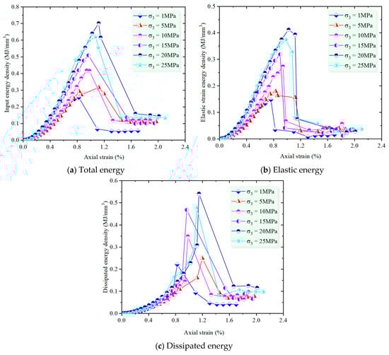 When subjected to the combined effects of axial stress (σ1) and confining pressure (σ3), the total energy uptake by rock samples during loading is calculated from the area under the stress–strain curves, As shown in Figure 7. Thus, the formula to determine the total energy absorbed by the samples is as follows: