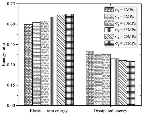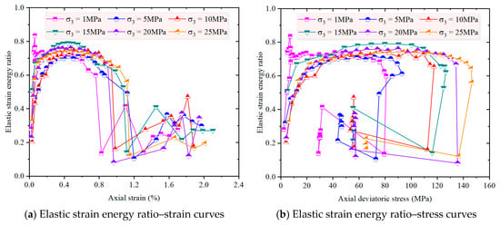 The degradation of rocks fundamentally pertains to a thermodynamic issue, encompassing the processes of energy uptake, conversion, and dispersion. Throughout testing, rocks adhere to the principle of energy conservation and thermodynamic laws under any form of loading. A higher density of elastic energy indicates a rock’s superior capability for elastic deformation, while an increased density of dissipated energy reflects more extensive damage during deformation. Consequently, the damage and deformation behavior of rock specimens during testing can be deduced by evaluating the ratios of elastic and dissipated energy. Figure 10 and Figure 11 display the progression curves of these energy ratios for rock specimens, correlating with stress and strain during CLU under triaxial conditions.