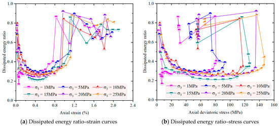 Stress–strain–energy dissipation ratio curves for rock samples subjected to triaxial CLU tests.