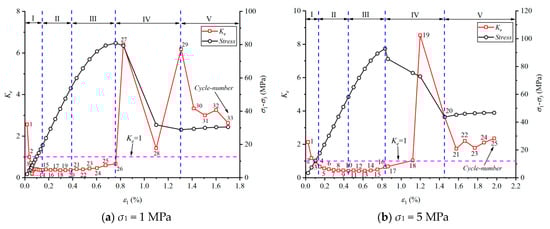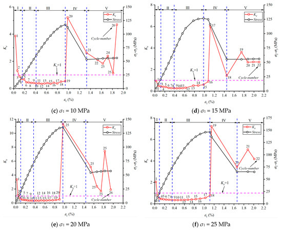 Illustrated by Figure 13 and Figure 14, during the CLU trials at varying confining pressures, the energy consumption ratio Ke initially experiences a sharp decrease (stage I), followed by a gradual slowdown in reduction (stage II), a slight rise (stage III), a significant increase at the peak stress inflection point (stage IV) and, ultimately, a slow decline towards stabilization (stage V) as the cycle count rises. Stage I is defined by the densification of pores and the closure of microscopic fractures; stage II involves the process of elastic deformation; stage III involves the extension and initiation of new cracks; stage IV is marked by the coalescence of cracks into a macroscopic fracture plane; and stage V shows that despite fracturing, the rock specimens maintain a level of load-bearing capacity under the confining pressure. The analysis of the rock specimens’ energy evolution during the CLU in Section 4.2 suggests that rock failure under load is defined by the rapid conversion of stored elastic strain energy into energy that is released and dissipated as cracks propagate, merge, and form fracture planes. Thus, the phase where the Ke ratio incrementally rises indicates the progression of the accrual of damage and plastic deformation within the rock. When Ke reaches a threshold and shows an inflection point, cracks propagate and coalesce, the main crack appears, and fracture planes are formed. Hence, this inflection point serves as a precursor signal for the impending failure of the rock when subjected to loading. The ratio of ud to ue was used as the amplified energy signal for failure of the rock, and its abrupt change can be used as a failure criterion for the rock.