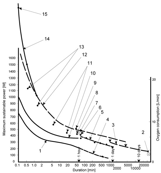 - Bussolari, S.R.; Nadel, E.R. The physiological limits of long-duration human power production-lessons learned from the Daedalus project. Hum. Power Tech. J. IHPVA 1989, 7, 1+8–10. [Google Scholar]