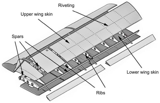 From the perspective of lift, the wing is a crucial element that, through appropriate shaping, enables the aircraft to stay airborne. The construction of the wing (Figure 4) is designed to withstand internal forces. The first structural element of the wing is the spars, which bear high loads and form the basis of the structure. They serve as nodal points connecting the wings to the fuselage. The next components are ribs, which maintain the proper airfoil shape and transfer the load from the skin to the spar. The outer element, the skin, forms the wing’s outer layer, serving as a sealant and generating lift force.
