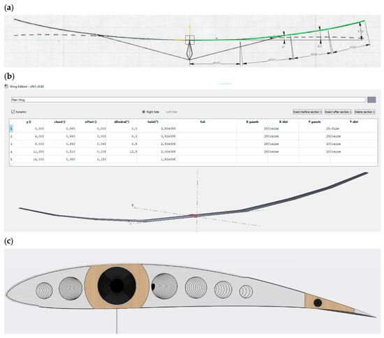 To support the design process, various novel engineering tools were employed. The 3DExperience platform enabled comprehensive model creation, parameter management, production process development, assembly instruction creation, and extensive analyses and simulations, including CFD flow simulations using the SST k-ω turbulence model [26,27]. XFLR5 was utilized to determine aerodynamic profiles and wing geometry through vortex lattice and panel method analyses [28,29]. JavaProp facilitated the analysis of propeller thrust, power requirements, and blade geometry [30,31].