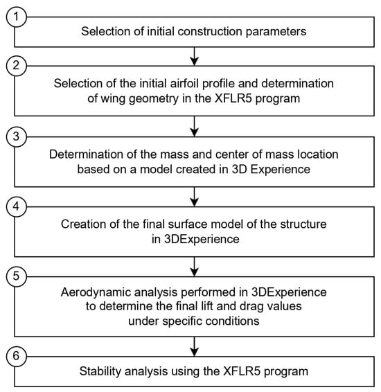 Aircraft design is a complex and interdisciplinary process. The design stage of HPAs requires synthesizing information from aerodynamics, basic machine design, materials science, and proficiency in CAD/CAM software. The design process follows several stages outlined in the literature [45], typically comprising ten steps (Figure 3), covering a wide range of design tasks. The first stage involves analyzing design requirements, which includes gathering information about similar constructions and precisely defining project expectations. Identifying design assumptions, especially related to the power system, is crucial. The second stage determines approximate dimensions and total mass based on technical solutions and aerodynamic principles. Data from existing constructions and empirical relationships are used. The third stage focuses on wing design, determining its geometry and selecting an appropriate airfoil. Parameters such as lift coefficient and aspect ratio are crucial for maintaining flight characteristics. The fourth stage refines the dimensions of the fuselage, maximizing ergonomics. For HPA, factors like pilot seat adjustment, fairing shape, and crankshaft placement are significant. The fifth stage focuses on determining the center of mass and the total mass of the construction. Semi-empirical relationships or CAD/CAM software can be used for this purpose. The sixth stage involves determining aerodynamic characteristics, such as drag and lift coefficients relative to flight speed. The seventh stage entails stability and controllability analysis, selecting control surface areas and ensuring they meet proportionality requirements. The eighth stage involves analyzing and optimizing key parameters. Necessary adjustments to the design are made if required. The ninth stage compares the completed design with initial design assumptions, allowing for modifications if necessary. The final, tenth stage involves evaluating the results and marks the end of the design phase. With the design in hand, construction of the ornithopter can commence.