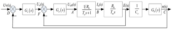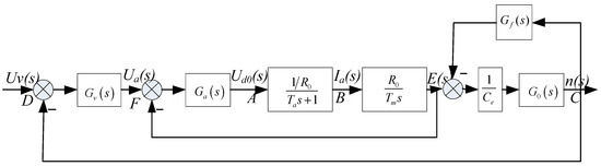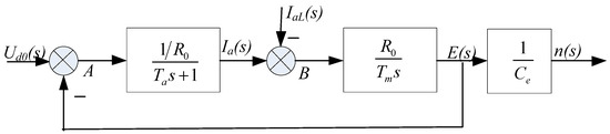 The electromechanical time constant Tm = JR0/CmCe. Combined with Equations (1)–(9), the motor dynamic structure block diagram can be obtained as shown in Figure 1.