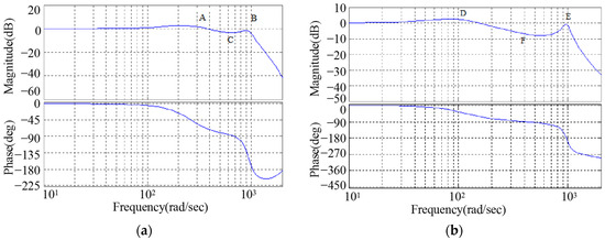 In Figure 7a, the closed-loop curve has two resonant peaks: A and B. Generally speaking, the amplitude of point A should not exceed 3 dB, otherwise the bandwidth of the system (±3 dB) will be too low, leading to the poor control effect of the system. It is also required that the amplitude of point B should not exceed 0 dB, otherwise the noise influence will be increased. The same index requirements are still applicable to points D and E in Figure 7b. When calculating the system bandwidth, we should find the frequency point of the amplitude–frequency characteristic curve at −3 dB, as shown in C and F in Figure 7. In the conventional range, the larger the system bandwidth, the better the system control effect.
