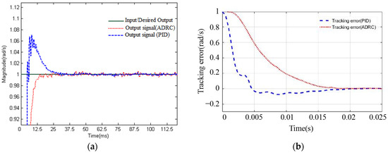 The input signal is set as the square wave speed signal with an amplitude of 1 rad/s and a frequency of 4 Hz to compare the control effect of the HO-ADRC and PID. The comparative result plots are shown in Figure 8.