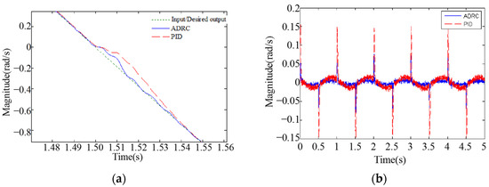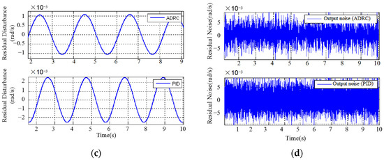 As can be seen from Figure 10c, the residual disturbance using HO-ADRC is 0.001045 rad/s; in contrast, the residual disturbance using the PID method is 0.002562 rad/s. The denoising ability of the HO-ADRC is also better than PID in Figure 10d.