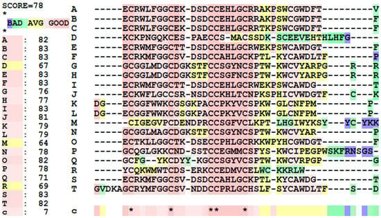 For the multiple sequence alignment of these top 20 peptides, given in Figure 3, the overall score for the peptides is 78, meaning that there is a high degree of similarity with the samples. Toxins A, B, C, E, F, I, J, O, S, and T have high sequence similarity, while D, M, and R are not as similar. Focusing on the sequences, there are five highly conserved cysteine residues, highlighting their importance in the toxins’ structure and biological activity. Aside from this, a huge chunk of the sequences have similarities, either having the exact same amino acid, or having amino acids that have similar physicochemical properties.