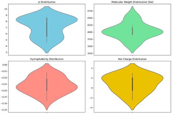 The violin plots of the physicochemical properties, as presented in Figure 3, show that the top-scoring peptides’ properties are bunched up to specific values, with a greater spread indicating that a greater number of peptides have those values for their physicochemical properties.