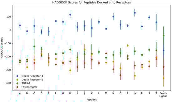 For DR-4, the top HADDOCK scorers are D, E, and B, and the lowest is Q. For DR-5, Q, H, and O, and the lowest is P. For TNFR-1, A, B, and M, and the worst is C. Finally, for the Fas Receptor, O, N, and I, and the lowest is M. Interestingly, Q is shared between DR-4 and DR-5, with it being the worst scorer in the former while the best in the latter. Other peptides shared by multiple receptors are B, a good scorer for DR-4 and TNFR-1, and M, a good scorer in TNFR-1, while being the worst in Fas.