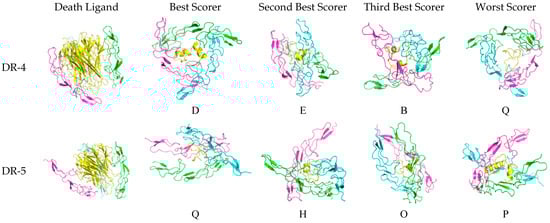 Docked death receptor and ligand systems. Green, blue, and pink represent chains A, B, and C of the receptor, while yellow represents the ligand. The letter of each docked system correspond to the identity of the peptide that was docked.
