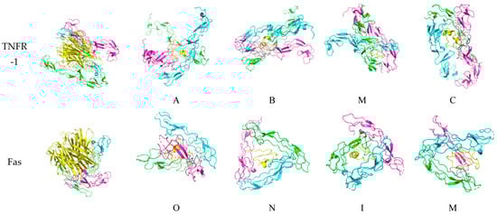For TNFR-1, the binding of A is slanted as compared to the other peptides, which are clasped vertically by the monomers. The blue chain in M is slightly skewed in binding as compared to the green and pink chains. The binding of TNF-α is also similar to what is found in characterization studies.