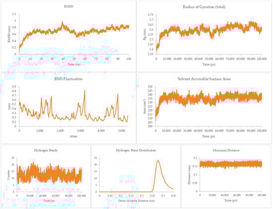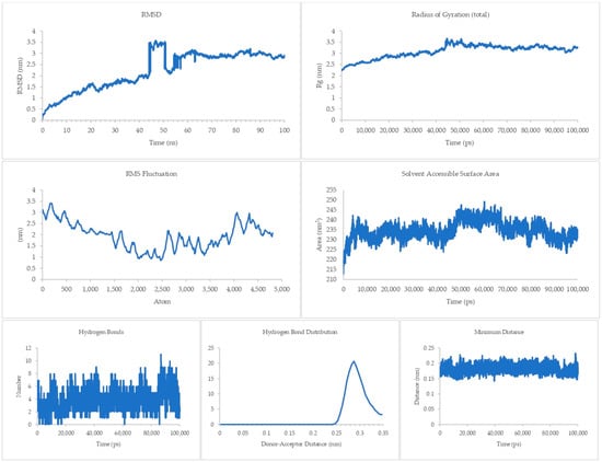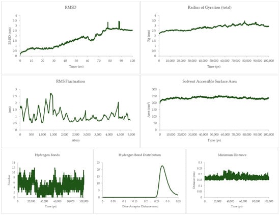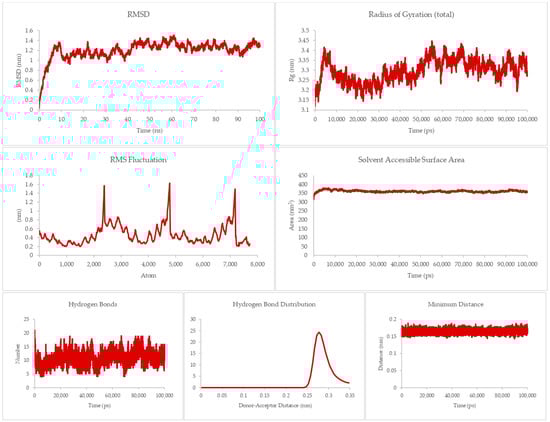 A different trend can be gleaned from the TNFR-1-A system, as shown in Figure 9. The RMSD ranges from 0.8 to 1.4 nm in the majority of the run. Although the magnitude of the RMSD is not as great as that for the DR4-Q system, the rises and dips throughout this system imply some conformational flexibility, as was observed for DR5-Q. This is supported by the RMSF where there are sharp rises, indicating that some atoms experience a great degree of change from their initial positions, and of the Rg, where the profile sees more ups and downs than the previous two systems, implying its greater susceptibility to conformational changes. Still, the magnitude of the conformational changes is not enough to destroy the complex. The SASA’s profile is interesting, as it plateaus to a value of around 350 cm2. This shows that the system is much less susceptible to intrusion by solvents.