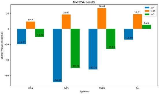 The ultimate measure of the receptor–peptide complexes’ stability is in the end-state binding energy, given in ΔG. MMPBSA calculations were initiated, as this model accounts for electrostatics. This model gave lower ΔG values than MMGBSA during the initial end-state thermodynamics calculations. For the four final systems, a chart of the ΔH, TΔS, and ΔG is given in Figure 11. Here, the most negative ΔG value is associated with the DR-5 system, while the highest is that of the Fas. This means that the association of DR-5 and Q is the most energetically favorable out of the four systems, while Fas, being the only system with a positive ΔG value, is the least stable. This also implies that the association will not be appreciable at equilibrium. Other than that, all other three exhibit a favorable association, making these systems stable at equilibrium.