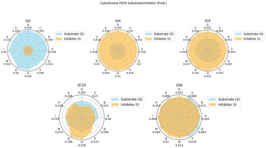 Radar plots of the ADMET characteristics of simulated theraphotoxins. Numerical values in Cytochrome P450 plots correspond to their probability as substrates.