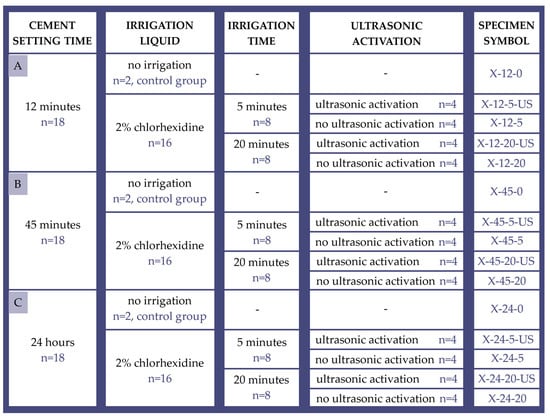 Figure 1 illustrates the distribution of cement specimens as well as adapted irrigation protocols.