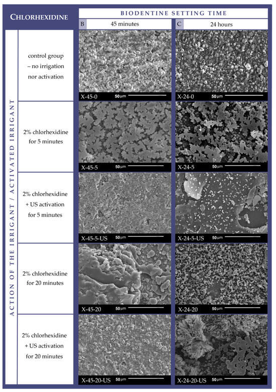 Images of cement specimens obtained via scanning electron microscope were compared. The results indicate that 2% chlorhexidine solution, both alone and ultrasonically activated, influenced the surface appearance of the investigated material in comparison to the control group (Figure 2).