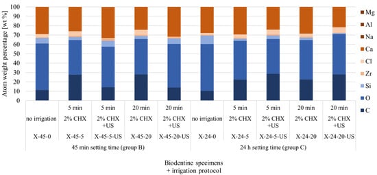 When compared to the control groups, the observed changes revealed the percentage increase in carbon (C) after all investigated irrigation protocols from 11.35 wt% (X-45-0) to maximum 28.0 wt% (X-45-20) in group B and from 10.41 wt% (X-24-0) to maximum 28.7 wt% (X-24-5-US) in group C. Similarly, the decrease in oxygen (O) was observed in every specimen from 49.61 wt% (X-45-0) to minimum 36.9 wt% (X-45-5) in group B and from 49.93 wt% (X-24-0) to minimum 37.1 wt% (X-24-5) in group C. A tendency was identified concerning the percentage of calcium (Ca). In group B, it was increased after CHX irrigation protocol involving ultrasonic activation from 28.87 wt% (X-45-0) to maximum 33.2 wt% (X-45-5-US), and slightly decreased after nonactivated rinsing procedure from 28.87 wt% (X-45-0) to minimum 24.4 wt% (X-45-20). The opposite scenario was discovered in group C where the percentage of Ca slightly rose after the CHX irrigation protocol without US activation from 27.74 wt% (X-24-0) to maximum 29.4 wt% (X-24-5), and decreased after ultrasonically enhanced irrigation from 27.74 wt% (X-24-0) to minimum 21.8 wt% (X-24-20-US). A decrease in the silicon (Si) level was noticeable in all of the material specimens from group C from 9.09 wt% (X-24-0) to minimum 1.0 wt% (X-24-20-US), and nonultrasonically irrigated material from group B from 5.96 wt% (X-45-0) to minimum 3.3 wt% (X-45-20). The specimens from group B that underwent the ultrasonically activated rinsing protocol revealed quasi-equal Si levels to the control group: 5.96 wt% (X-45-0), 6.3 wt% (X-45-5-US) and 5.8 wt% (X-45-20-US). On the contrary, an increase in chlorine (Cl) level was noticeable in all of the material specimens from group C from 2.09 wt% (X-24-0) to maximum 5.7 wt% (X-24-20-US), and nonultrasonically irrigated material from group B from 3.64 wt% (X-45-0) to maximum 5.3 wt% (X-45-20). The specimens from group B that underwent the ultrasonically activated rinsing protocol revealed a decreased Cl level when compared to the control group: 3.64 wt% (X-45-0), 0.7 wt% (X-45-5-US) and 0.2 wt% (X-45-20-US). The zirconium (Zr) percentage was augmented in material from both groups after every irrigation protocol, except the 24 h setting specimen after 20 min ultrasonically enhanced rinsing with CHX (X-24-20-US).