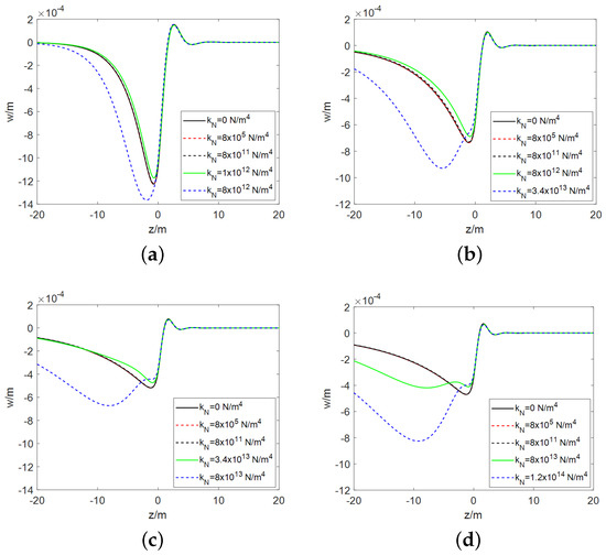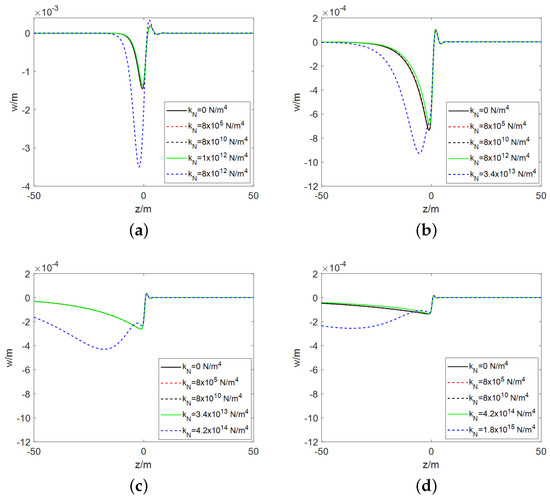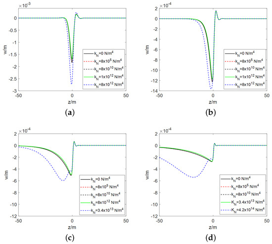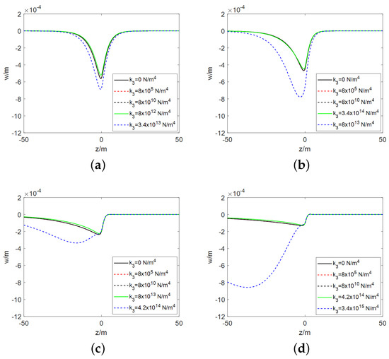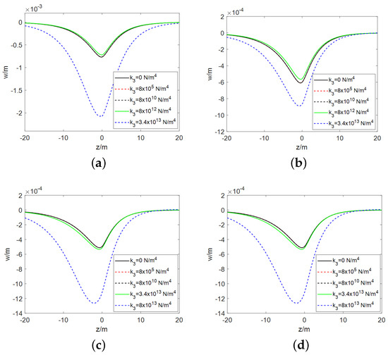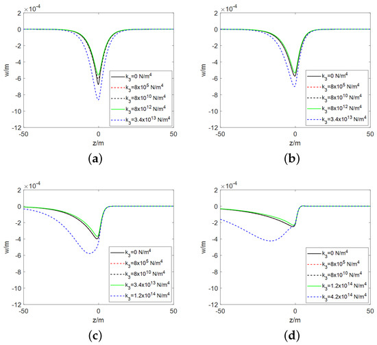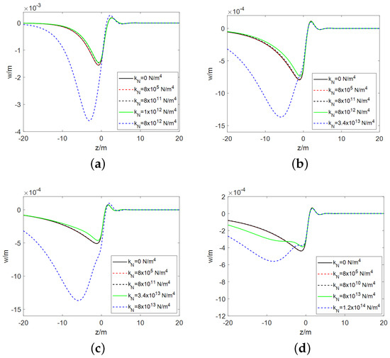 - For both beam models, when the nonlinear stiffness is relatively low, the position of the wheel is almost coincident with the location of maximum pavement deformation. As the nonlinear stiffness increases, a noticeable offset occurs between the two positions, with the wheel positioned ahead of the area where the pavement deforms the most. The greater the nonlinear stiffness, the larger the offset between them. Comparatively, the offset effect is more pronounced in the E-B beam model.