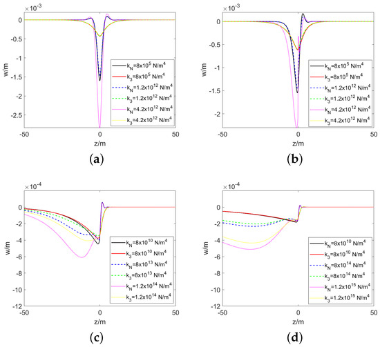 - Both the E-B beam model and the Timoshenko beam model have a threshold for the nonlinear stiffness of the foundation. When the nonlinear stiffness is below this threshold, its impact on the pavement deformation is negligible or minimal. However, when the nonlinear stiffness exceeds the threshold, the pavement deformation initially experiences a minor reduction, which is then followed by a substantial increase as the nonlinear stiffness rises. The magnitude of this threshold is not fixed and is primarily influenced by the vehicle velocity and the foundation damping coefficient, increasing with higher vehicle velocities and greater foundation damping. Under the same parameters, the threshold for the Timoshenko beam is significantly higher than that for the E-B beam.