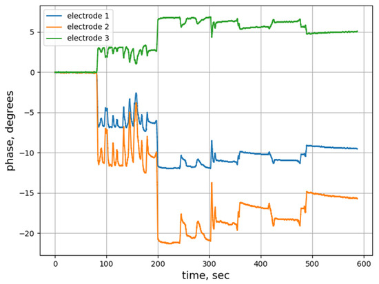 The immersion process was conducted in stages, starting from the 80 s mark and continuing at 50 s intervals, with a drill penetration step of 10 cm. Voltage changes on the receiving electrodes were recorded with a sampling frequency of 10,101 Hz. The phase shift of the output signals (see Figure 3 and Figure 4) was monitored during the drill’s passage through various soil layers. Observations showed that the phase of the electrical signals varied as the drill moved through layers with distinct electrical characteristics, which is crucial for assessing the impact of different soil layers on railway track stability.