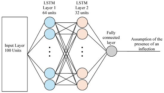 The developed LSTM model had the following architecture (Figure 5): the input layer size corresponded to the time step length, which was set to 100; the first LSTM layer contained 64 neurons with the tanh activation function; the second LSTM layer contained 32 neurons with the tanh activation function; the fully connected layer contained 1 neuron with the sigmoid activation function to predict the probability of a bend. The model was trained using the Adam optimizer, and the loss function was binary cross-entropy. Training was carried out over 20 epochs with a batch size of 64.