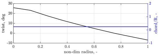 Both pylon and propeller blades are assumed to be rigid, whereas the mounting stiffness at the propeller’s pivoting point allows for pitch and yaw rotation modeling a flexible pylon system [9]. Consequently, a typical 2-degrees-of-freedom model for propeller whirl flutter, consistent with state-of-the-art practices, was established. The propeller blades are assumed to have a symmetrical NACA0012 airfoil. The blade geometrical parameters are presented in Figure 1 showing a linear twist and a constant chord distribution.