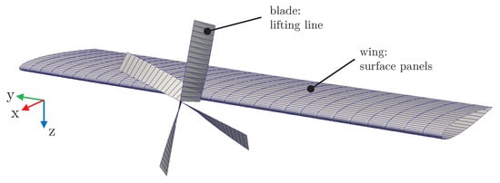 The corresponding wing-propeller models used for the hybrid and fully coupled analyses in MBDyn and DUST are described below. As given in Table 1, the structural components of the system are modeled in MBDyn. An overview of the model setup is given in Figure 2.