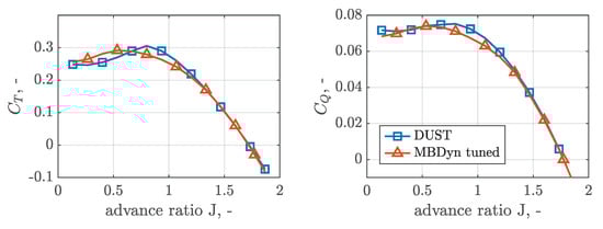 To ensure consistency in the aerodynamic modeling of the propeller, a comparison was conducted based on the two different time-domain analysis approaches. This was achieved by examining the performance curves for the standalone propeller without the presence of the wing. The thrust and torque coefficients with reference to the advance ratio for the simulations conducted using DUST and MBDyn are presented in Figure 4, considering a collective pitch angle of 38.2°. The aerodynamic model in MBDyn was tuned with a linear tip loss function to consider the three-dimensional effects on the blades and with an empirical correction factor ( = 1.3) on the dynamic inflow model to include the power losses. These modifications were required to match the thrust and torque curves obtained in DUST. As observed in Figure 4, both curves exhibit a perfect match, indicating a consistent aerodynamic modeling approach.