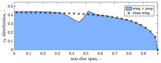 Since the aerodynamic interaction effect is the main focus of this study, a time-domain simulation of the clean wing and the wing-propeller system is performed in DUST to highlight the impact of aerodynamic interference on load distribution in a steady-state condition. The angle of attack is set to 5° with the propeller operating in the thrusting condition. Symmetry at the half-wing root is assumed, and the sectional loads are post-processed. For both simulations, the spanwise distribution of the wing is shown in Figure 6. The expected elliptical distribution is seen for the clean wing (dashed line). For the wing-propeller system (solid line), local peaks in sectional arise due to the propeller wake. The peak’s center corresponds to the hub span position of the propeller.