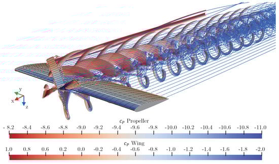 The behavior is similar to those found in the literature [33,34], with the low values for the up-moving half of the propeller disk and positive on the down-moving half. Figure 7 depicts the flow field of the coupled wing-propeller model through the iso-surfaces of the Q-criterion. The pressure coefficient contours are shown for both the propeller and the wing. The interactions of the propeller wake with the wing are clearly visible. High vortex areas are observed for the helical system generated by the propeller system and for the tip vortices of the wing.