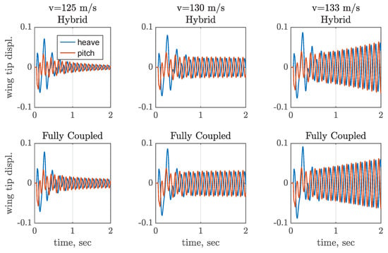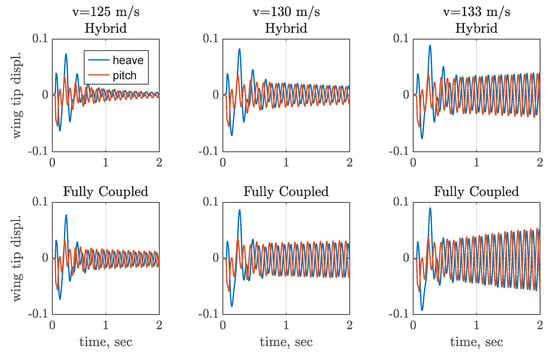 Each plot represents the dynamic response of the wing’s tip node in pitch and heave. The figures on the top illustrate the response obtained with the hybrid approach, whereas the figures on the bottom display the response obtained with the fully coupled approach. At the beginning of the simulations, the transient behavior due to the blended impulse is observable. After a few milliseconds, most of the excited modes are damped due to aerodynamic effects. Subsequently, the poorly damped dynamic survives, which is used to identify the dynamic response characteristics. A preliminary stability assessment can be performed by visual inspection of the time histories. For both simulation approaches, an unstable behavior is observed at a free stream velocity of 133 . At 125 and 130 , the measured responses exhibit stable and indifferent behavior, respectively. The results of the MPE in the form of eigenfrequencies and damping ratios are summarized in Table 8.