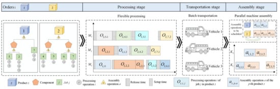 As an extension of the classic job shop scheduling problem (JSP), the multi-stage, multi-level assembly job shop scheduling problem (MsMlAJSP) not only involves multiple stages of production from processing to assembly but also considers complex assemblies composed of multiple jobs with a tree-like multi-level structure consisting of components and subassemblies []. It plays an important role in quickly responding to the manufacturing of customized products with multi-variety and small batches.