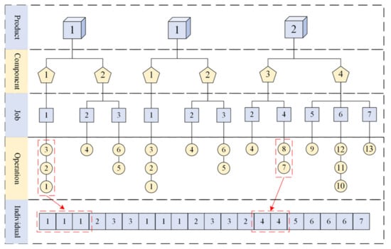 To better illustrate the encoding process, we use an example where the demand for product 1 is 2, and the demand for product 2 is 1. Product 1 consists of components 1 and 2, while product 2 consists of components 3 and 4. Component 1 is composed of job 1; component 2 is composed of jobs 2 and 3; component 3 is composed of jobs 2 and 4; and component 4 is composed of jobs 5, 6, and 7. Each job is processed through corresponding operations. For example, job 1 includes operation 1, operation 2, and operation 3. The bottom encoding sequence represents the order of operations for each job, such as [1 1 1 2 3 1 1 1 2 3 2 4 4 5 6 6 6 7], where [1 1 1] denotes the three operations of job 1. The specific encoding method for this example is shown in Figure 2.
