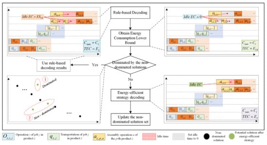 Step 6: If all operations have been checked, use Equation (19) to determine whether the idle intervals meet the shutdown conditions for profit and loss time, and output the results and of the scheduling scheme after executing the energy-efficient strategy. Then, update the non-dominated solution set. Otherwise, return to Step 5.