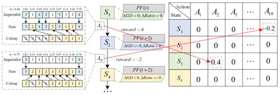 Reinforcement Learning (RL), such as Q-learning, possesses strong decision-making and optimization capabilities. Recent studies have shown that Q-learning can effectively adjust algorithm parameters, enhancing the balance between exploration and exploitation and improving solution quality. Chen et al. [] applied SARSA and Q-learning to adaptively adjust the crossover and mutation probabilities of a genetic algorithm (GA) during the early and late stages of optimization in flexible job shop scheduling problems. Chen et al. [] used Q-learning to dynamically adjust key algorithm parameters in multi-objective planning and scheduling for PCB assembly lines. Li et al. [] applied Q-learning to adaptively adjust neighborhood sizes in solving green flexible job shop scheduling problems with Type-II fuzzy processing times (ET2FJSP), thereby increasing the diversity of Pareto solutions. These studies demonstrate the effectiveness of Q-learning in parameter adjustment, highlighting its potential to improve the performance of algorithms in various scheduling problems. These successful applications of Q-learning in parameter adjustment encourage us to adopt this approach for solving the EEMsMlAJSP.