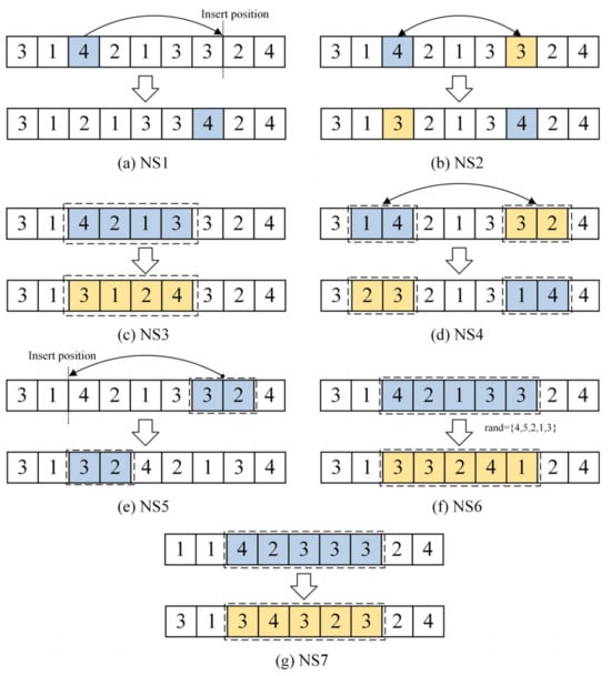 As described in Section 2.1, the problem characteristics of the EEMsMlAJSP result in an exceptionally large solution space. If full encoding is applied to each stage, although the entire solution space can be effectively represented, it also results in the algorithm convergence being slowed and invalid solutions being generated during the algorithm iteration process needing to be repaired, thus affecting the search efficiency of the algorithm. Heuristic rules can effectively trim the solution space while maximizing the discovery of near-optimal solutions to the problem; thereby, the convergence speed of the algorithm is improved. Therefore, based on the coupling properties between the stages of the EEMsMlAJSP [,], only the processing operations in the processing stage are encoded, with the assignment of processing machines and the sub-problems in subsequent stages being decoded using heuristic rules.