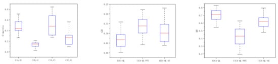 Box plots of three metrics between IICA-QL and IICA-QL-PFE/IICA-QL-AE.