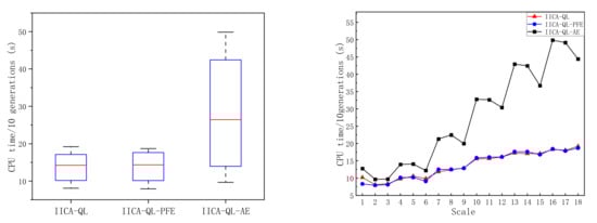 CPU time results of IICA-QL, IICA-QL-PFE, and IICA-QL-AE.